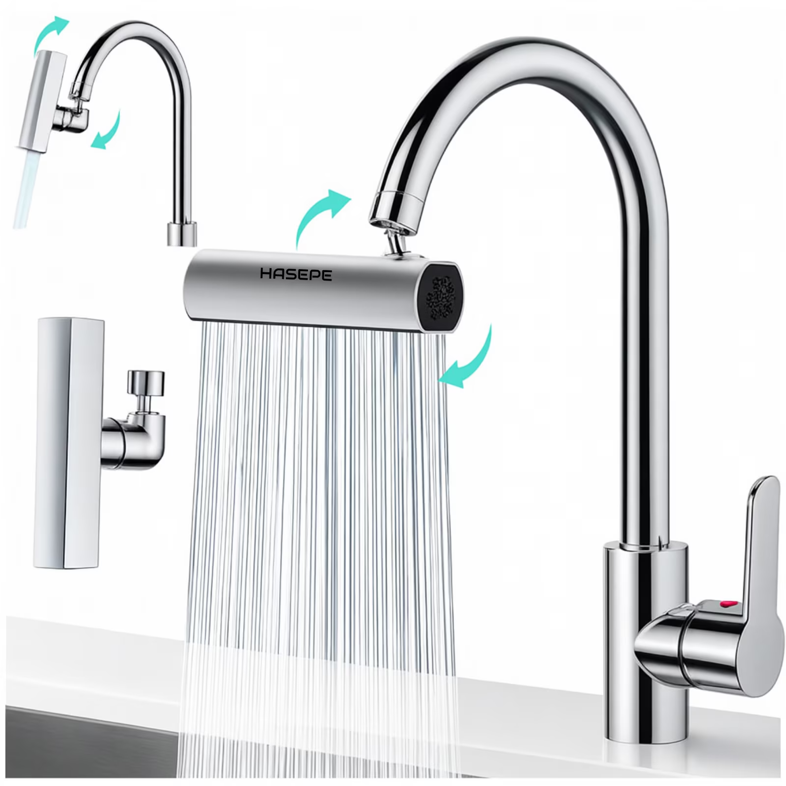 Adaptor robinet cu design rotativ 360° permite directionarea precisa a jetului, facilitand spalarea vaselor, curatarea chiuvetei sau igiena personala. Extensie robinet este echipata cu 4 functii diferite de curgere, inclusiv pulverizare si jet reglabil, oferind flexibilitate in functie de nevoi.