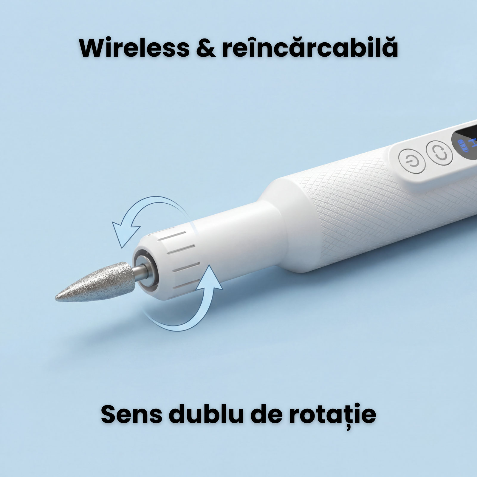 Freza unghii functioneaza pe baza de acumulator, oferind libertate de miscare si autonomie practica fara dependenta permanenta de priza. Statia de incarcare inclusa ajuta la organizare eficienta si pastrarea dispozitivului pregatit pentru utilizare constanta. Forma ergonomica contribuie la reducerea oboselii mainii in sesiunile mai lungi.