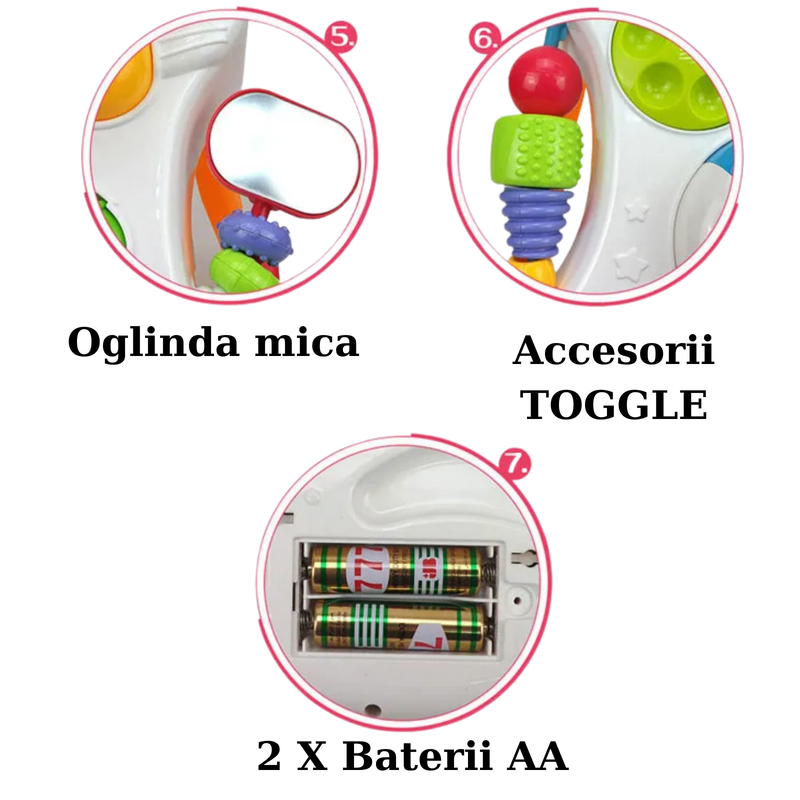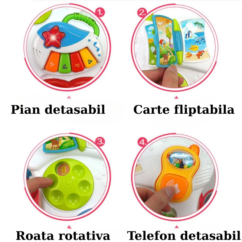 Centru multifunctional 7 in 1: pian luminos si sonor, telefon de jucarie, tabla magnetica pentru desen, oglinda si diverse jucarii educative care stimuleaza coordonarea si atentia.