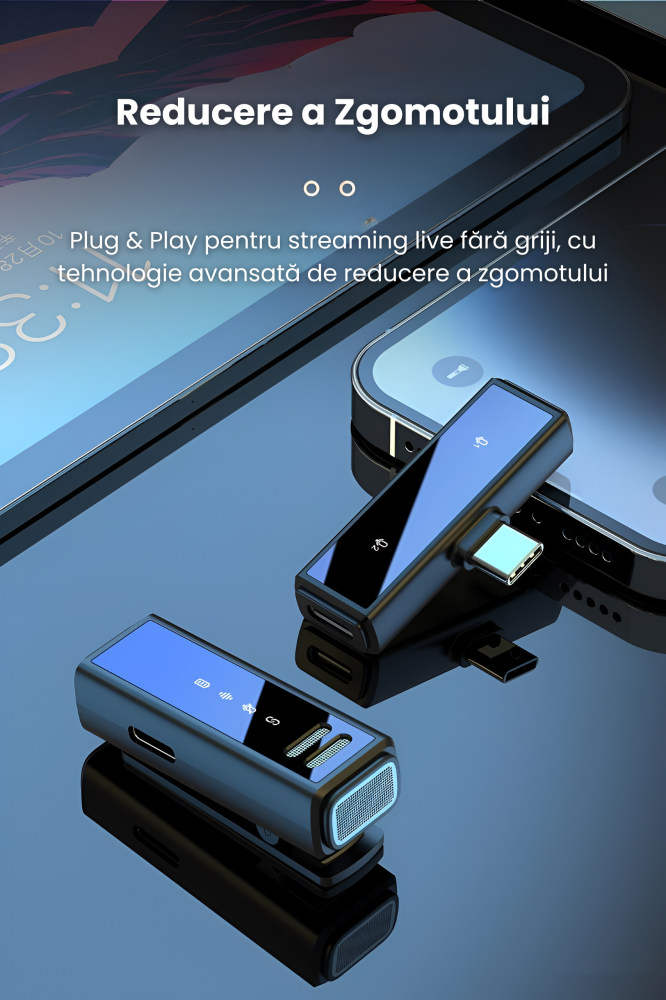 Pachetul include: 2 microfoane lavalieră wireless, receptor Type-C/Lightning, cabluri de încărcare și manual de utilizare.