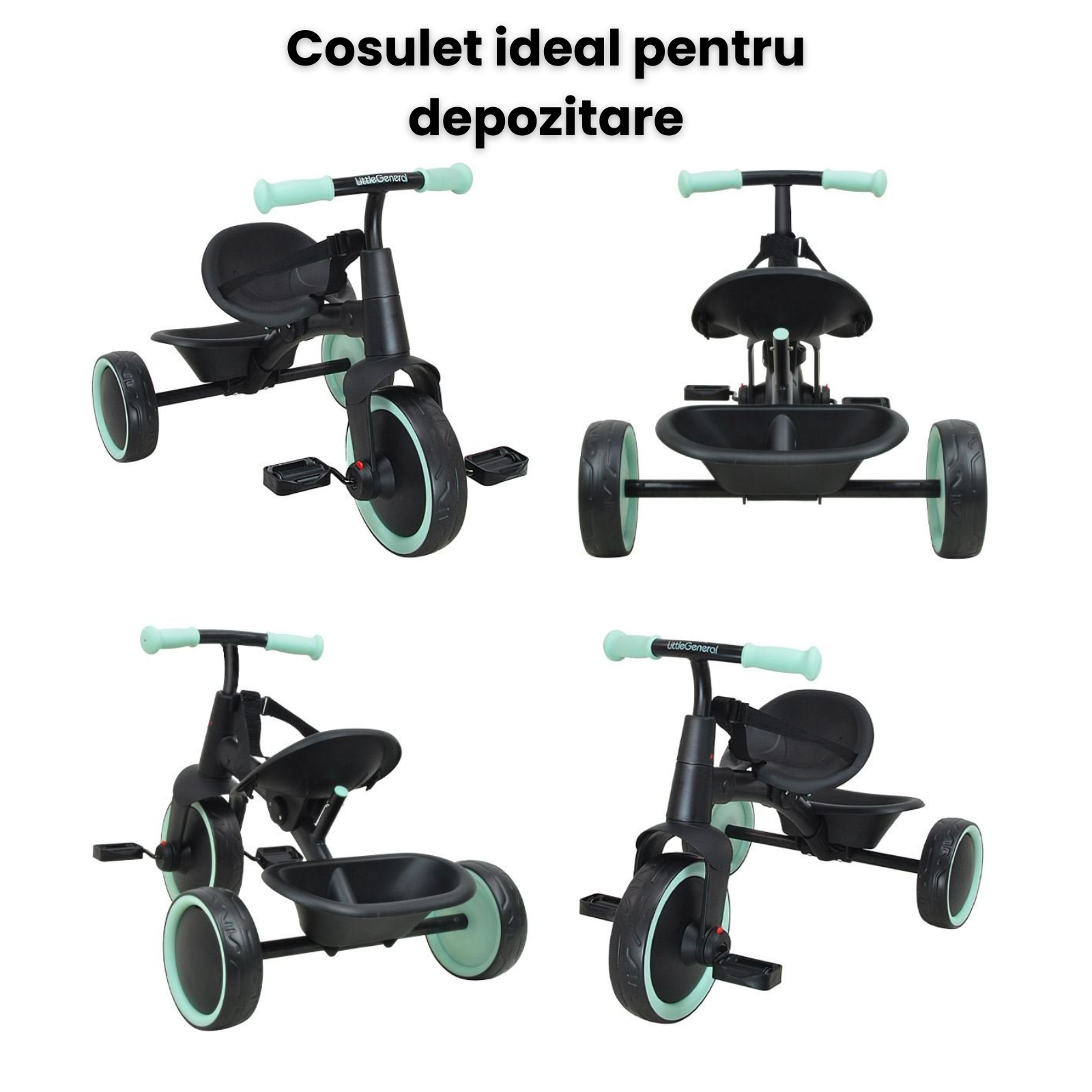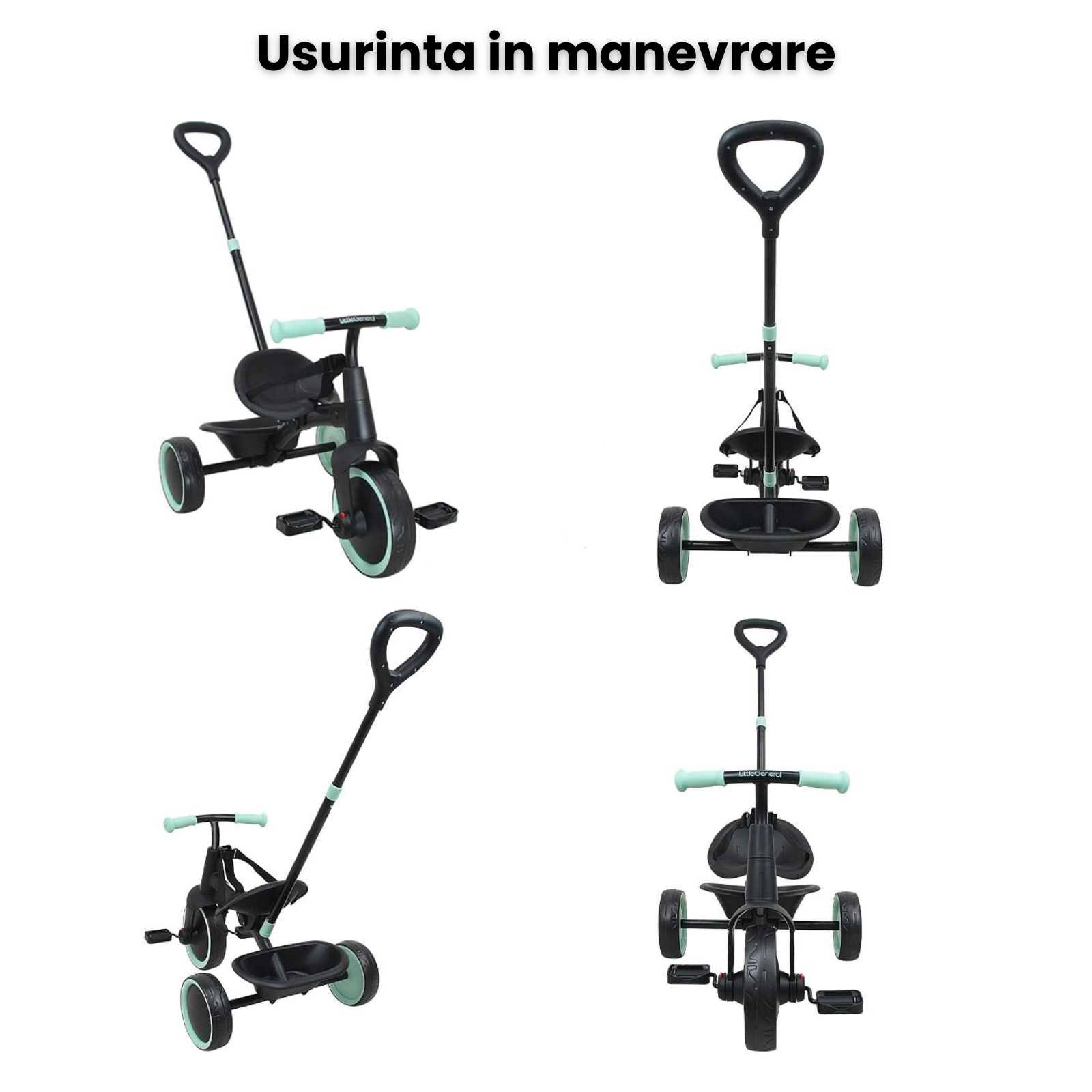 Culorile moderne negru-verde menta fac tricicleta atractiva si potrivita pentru fete si baieti, fiind o alegere practica si eleganta pentru orice familie.