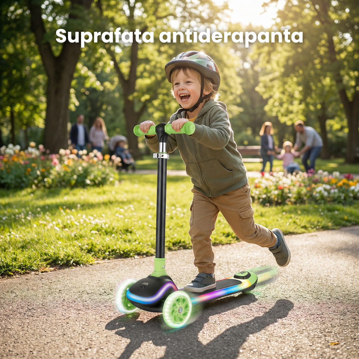 Fiind o trotinetă pentru copii simplă și intuitivă, nu necesită reglaje complicate sau întreținere specială. Trotineta cu led poate fi folosită zilnic pentru joacă în aer liber, contribuind la dezvoltarea coordonării și a încrederii în mișcare.